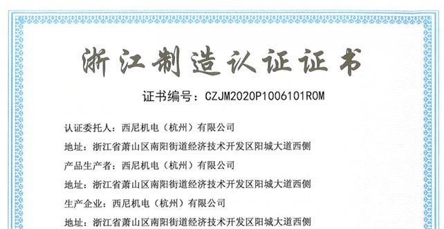 近日,西尼機電榮獲“浙江制造”認證證書。浙江制造國際認證聯盟經過現場評審和考察,一致認為我司已達到了“浙江制造”認證標準的要求,肯定了我司先進的管理模式和優(yōu)質的產品品質,且表明我司的產品技術工藝在