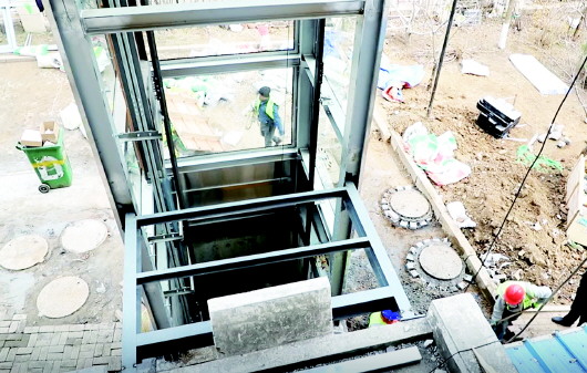 加裝電梯施工現場。 本報3月9日訊(半島全媒體記者朱佳鑫) 老樓加裝電梯,如今在青島已經不是新鮮事了,可是在市北區(qū)福嶺嘉苑小區(qū),一座15“歲”堪稱正青春的居民樓,有個單元卻成功加裝了電梯