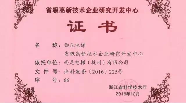 西尼電梯獲取“浙江省省級高新技術企業(yè)研究開發(fā)中心”榮譽證書