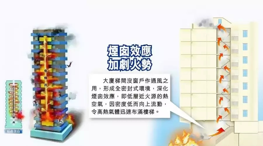 當(dāng)建筑物內(nèi)發(fā)生火災(zāi)時,煙囪效應(yīng)會將濃煙或火苗抽入井道內(nèi),造成火災(zāi)危情的擴(kuò)散。