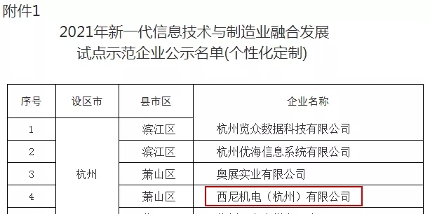 近日,浙江省經(jīng)濟(jì)和信息化廳官網(wǎng)發(fā)布公示了“2021年省級(jí)新一代信息技術(shù)與制造業(yè)融合發(fā)展試點(diǎn)示范企業(yè)名單”,西尼機(jī)電基于“電梯產(chǎn)品快速定制設(shè)計(jì)制造能力”入圍,是兩化融合管理體系貫標(biāo)方向——個(gè)性化定制細(xì)分中,杭州地區(qū)僅入選的八家企業(yè)之一。