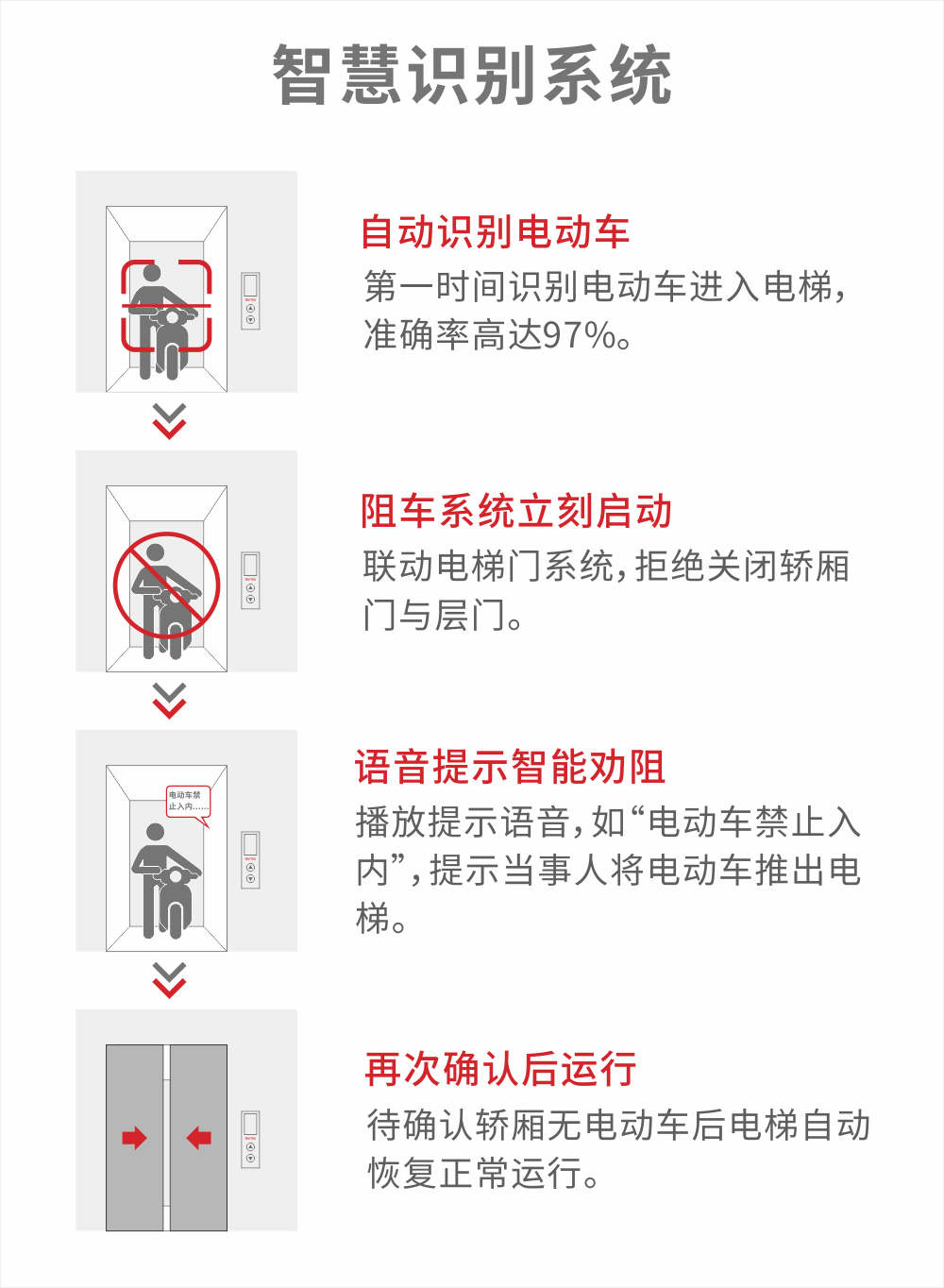 火患猛于虎,電動(dòng)自行車禁止入樓入戶,這不僅是對(duì)自己,也是對(duì)別人的生命負(fù)責(zé)。電動(dòng)車一旦自燃著火,不僅溫度急速提升,同時(shí)還會(huì)伴隨大量有毒濃煙,極易引發(fā)傷亡事故?,F(xiàn)在全國(guó)各地都在嚴(yán)抓的同時(shí),還建議為電梯安裝“智慧識(shí)別系統(tǒng)”,可作為保障業(yè)主生命財(cái)產(chǎn)安全的又一道堅(jiān)固防線。