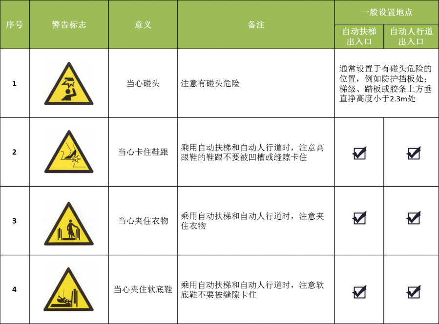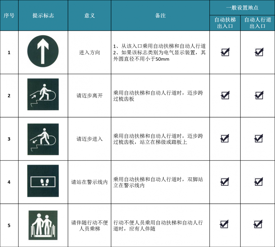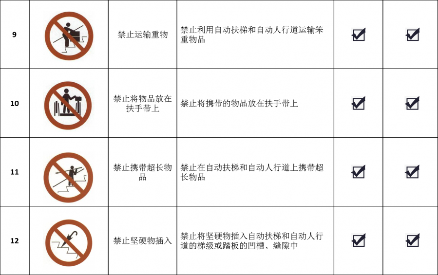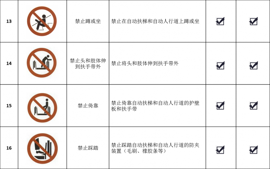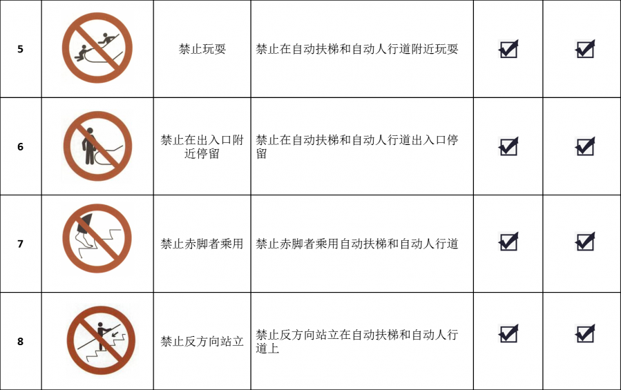 自動(dòng)扶梯和自動(dòng)人行道乘用安全標(biāo)志主要分為禁止標(biāo)志、警告標(biāo)志、指令標(biāo)志和提示標(biāo)志等,它們通常簡(jiǎn)單易懂、一目了然,以圖標(biāo)的形式設(shè)置在危險(xiǎn)或醒目位置。大家在乘坐自動(dòng)扶梯和自動(dòng)人行道時(shí)要悉心留意這些圖形標(biāo)志,嚴(yán)格遵守相關(guān)要求,保證自身人身安全。